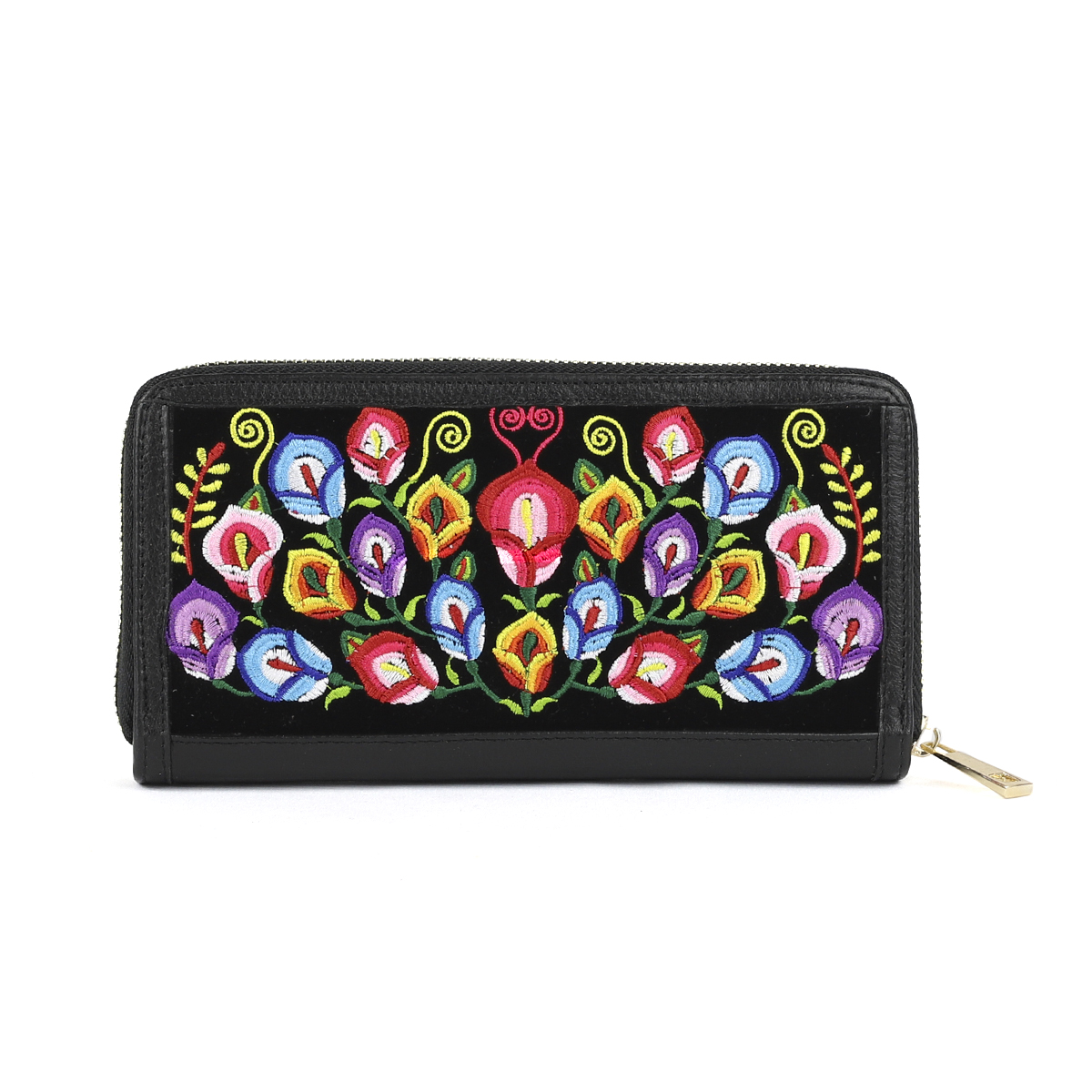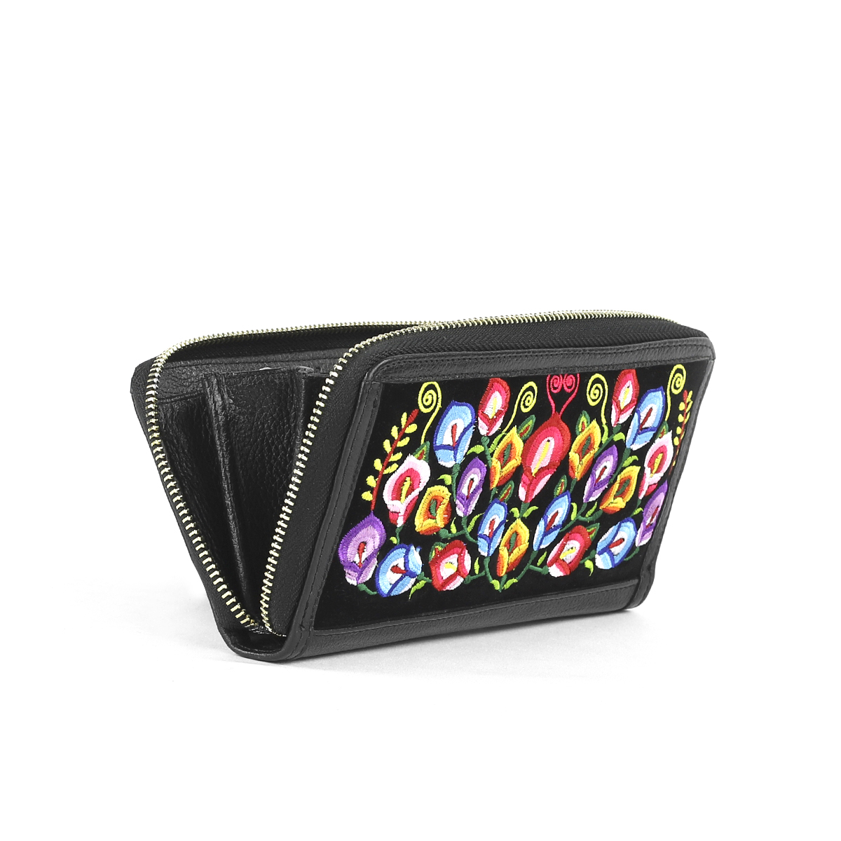 Cartera de doble vista elaborado por manos Oaxaqueñas confeccionada con piel y flores bordadas en colores llamativos, inspirado en la riqueza cultural y el trabajo artesanal de la región de Oaxaca.